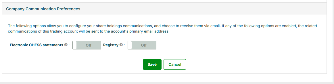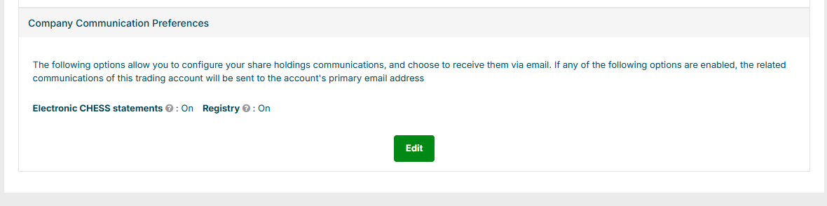 By enabling this setting, the primary email address for the account will be electronically transmitted to all share registries you have holdings with. This is turn ensures that electronic communications is turned on with all communications being sent to the primary email address on the account.