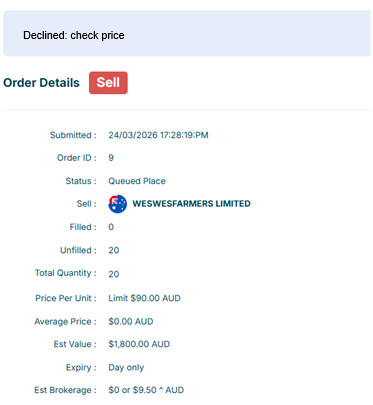 For example, when trading ASX shares, entering a price too far from the last traded price may result in an order being cancelled.